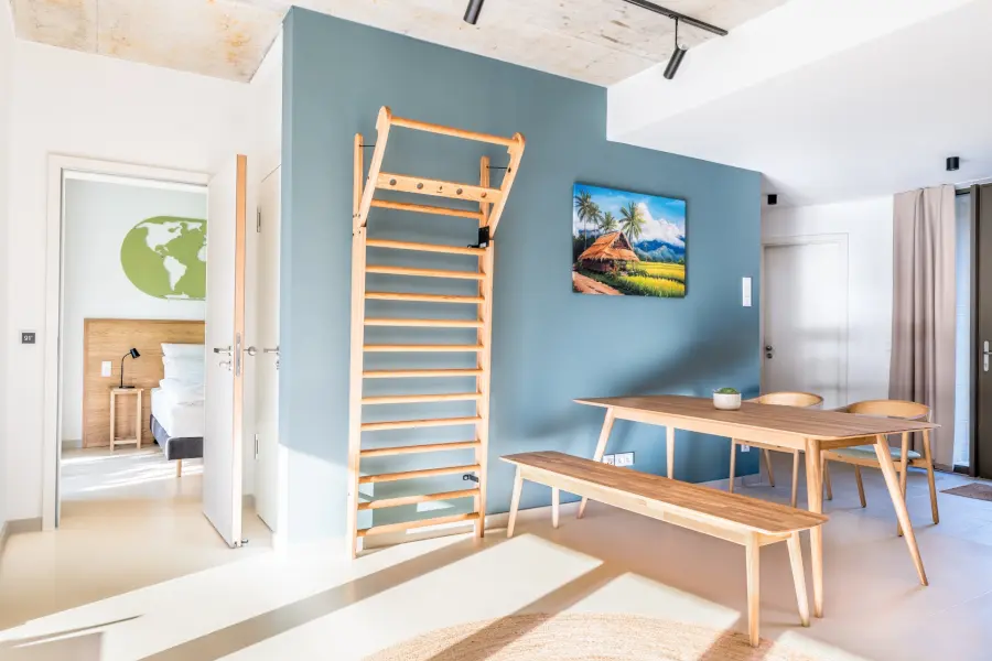 Ein Apartment verfügt je nach Kategorie dabei über 1–3 Schlafzimmer und 20 der 23 Apartments auch über einen zusätzlichen Teamraum. Alle Zimmer sind dabei einzeln verschließbar.