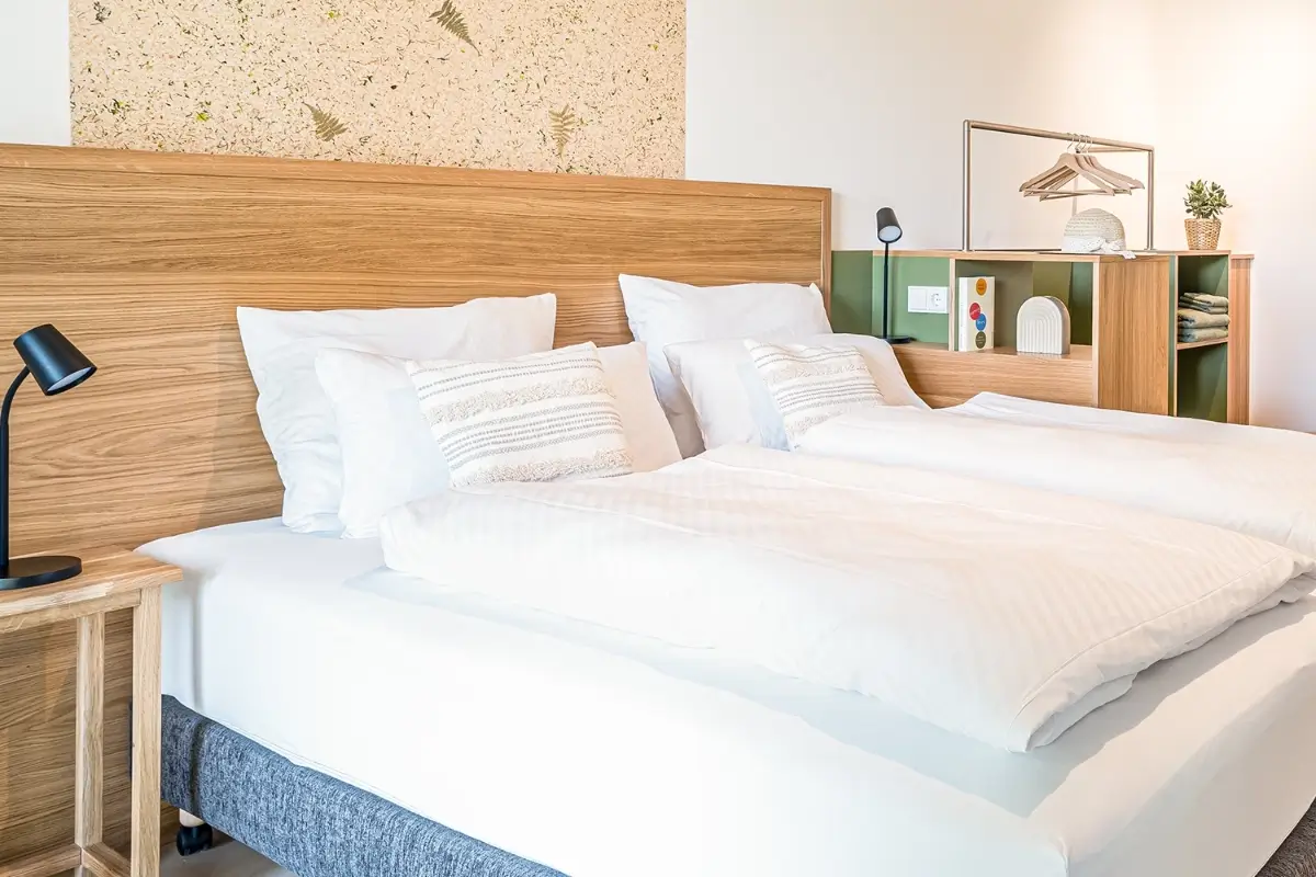 Das 360° bietet selbstverständlich den gewohnten Standard eines Business-Zimmers für 1 oder 2 Personen, mit eigenem Bad. Unsere modernen, lichtdurchfluteten Zimmer sind darüber hinaus aber immer auch als Team-Apartments, zu Einheiten mit einem gemeinsamen Teamraum zusammengefasst. Ideal für Mini-Workshops oder als Rückzugsort für das spontane Meeting.